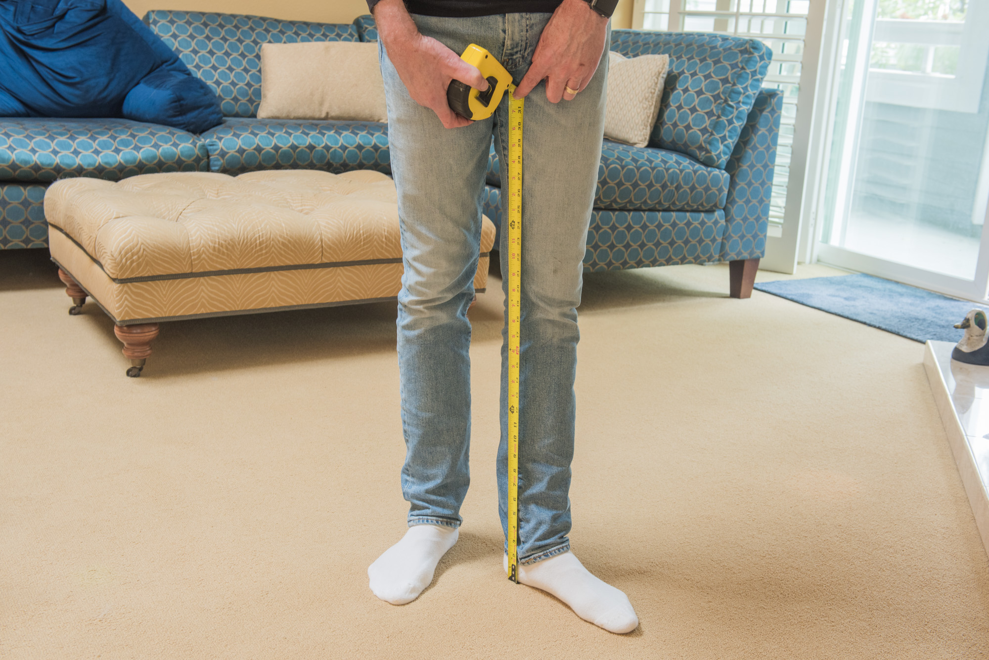 - First, measure your inseam with a measuring tape from floor to your crotch. Again, for this example, our 6’1″ man has a 34″ inseam.
