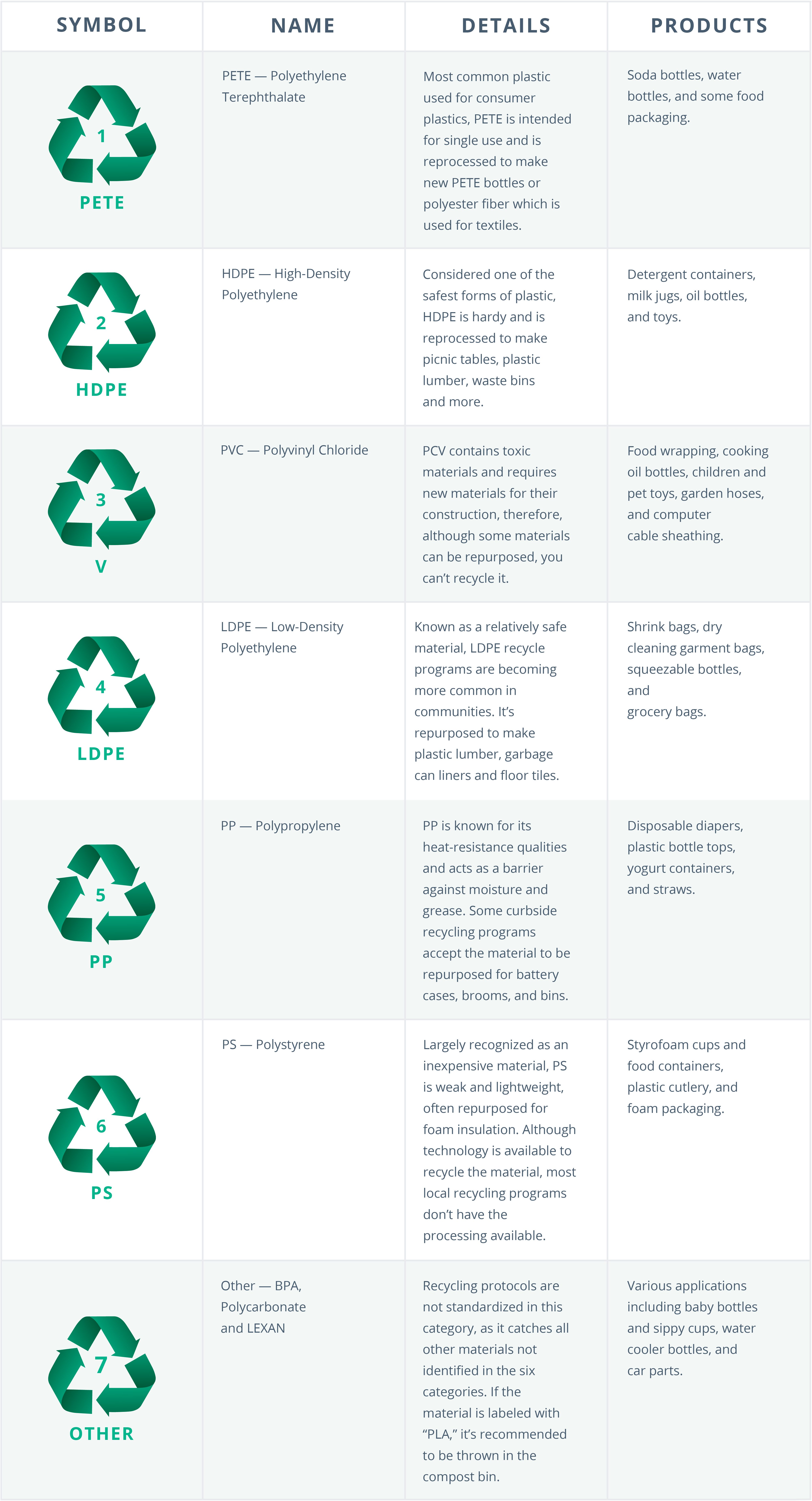 Have you ever noticed the symbols labeled on your materials? From teething rings to your standard single-use water bottle, you can determine what materials are recyclable by referencing the symbol labeled on the bottom of the product. Learn more about what each symbol meals with examples of what products typically use each material. Then, find out what recyclables your local community is capable of processing.