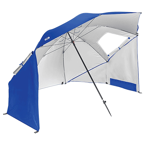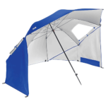 If you don’t mind an untraditional beach umbrella, the Sport-brella is a great choice! Rather than standing up like a typical umbrella, it sits propped on the sand by two side flaps that descend from the umbrella body. The Sport-brella has two large wind flaps on either side for ventilation and includes stakes and tie-down cords for extra security.