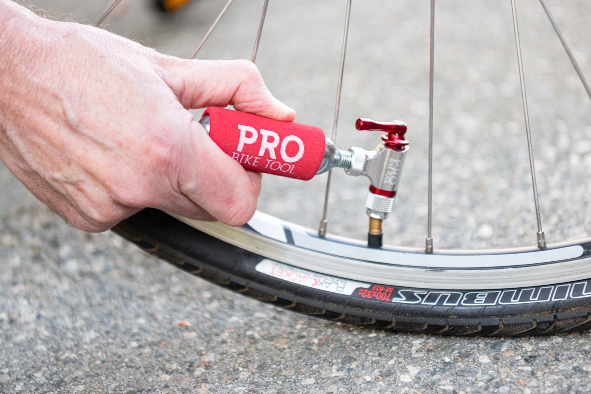 When the CO2 is released, the cartridge gets icy cold, and the Pro Bike Tools inflator has a rubber foam sleeve that slides over the cartridge to protect your hand. (The cartridge is recyclable, so take it with you and dispose of it responsibly.)