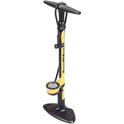 While styles vary slightly, floor pumps all work the same way. With the base on the floor, the rider uses gravity and leverage to push air into the tire while standing over the pump and pressing down on the handle. As the tire inflates, resistance builds, and it becomes more difficult to add air to your desired pressure. But the leverage from standing up and using your body weight to push down makes it relatively easy to achieve full inflation.
