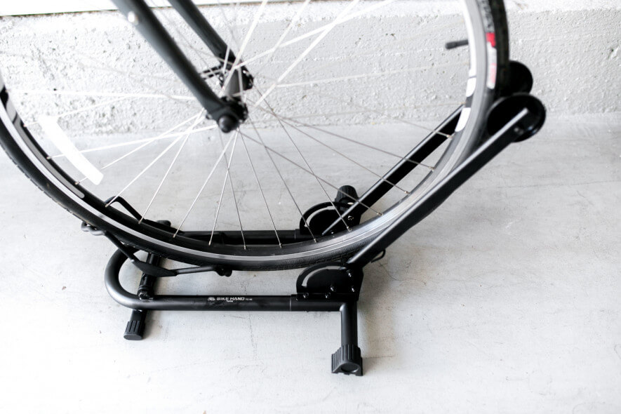 Right out of the box, we knew we had a winner with the Bike Hand – Parking Rack. This is a sturdy and well-made steel frame that unfolds in a second by pushing a small knob, which releases its vertical arm. That’s pretty much it for setup. The front wheel of the bicycle is guided into the frame, automatically locks into place, and the bike stands on its own.
