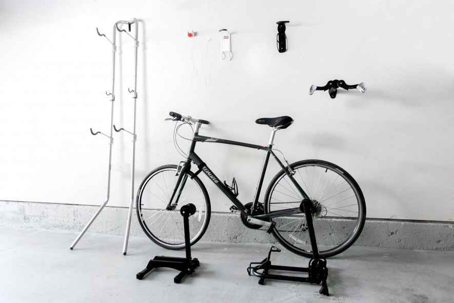 This type of bike storage is popular with people who have several bikes they need to store in their garage but have no floor space. It consists of two pulleys — positioned over the bike seat and handlebars — that are screwed into ceiling joists. Two double hooks are attached to the pulleys, which are then lowered, attached to the bike’s seat and handlebars. Pulling on the pulley ropes elevates the bike up to the ceiling. We did not test this type of bike storage because our tester’s garage did not have high-enough ceilings.