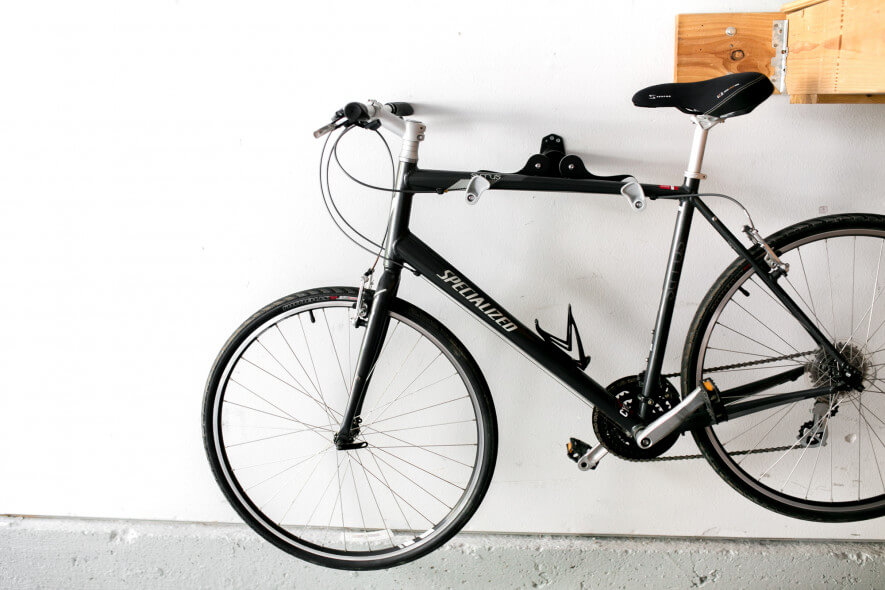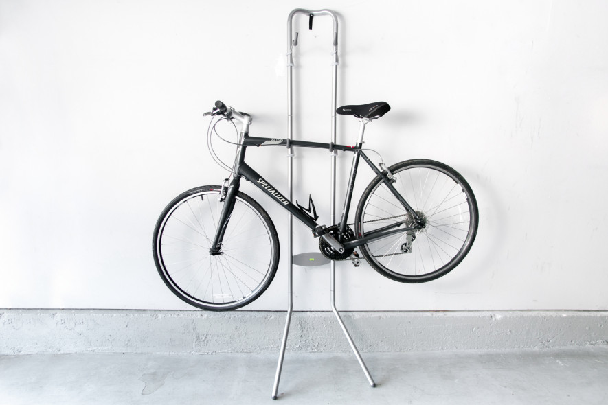 A so-called gravity rack is designed to support one or two bikes upright in a horizontal position. Installation involves nothing more than screwing its ladder-like frame together and adjusting its arms from which the bike hangs. The rack simply leans against any wall. If you live in an apartment or rental home, and your landlord doesn’t allow holes to be drilled into walls, a gravity rack is your best option.