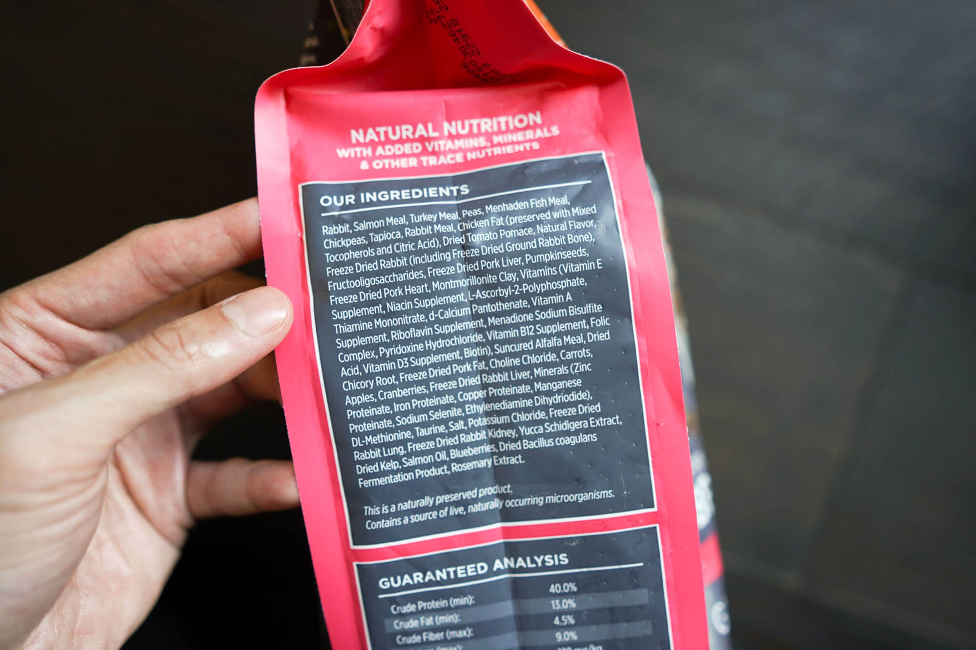 Both the duck and rabbit recipes start out with whole meat, followed by four meat meals, which is exceptional. Like many other kibbles, one of the primary ingredients is peas, tapioca and/or chickpeas. But Instinct throws in the freeze-dried meat cubes as a bonus, boosting up the protein and providing another excellent source of raw meat.