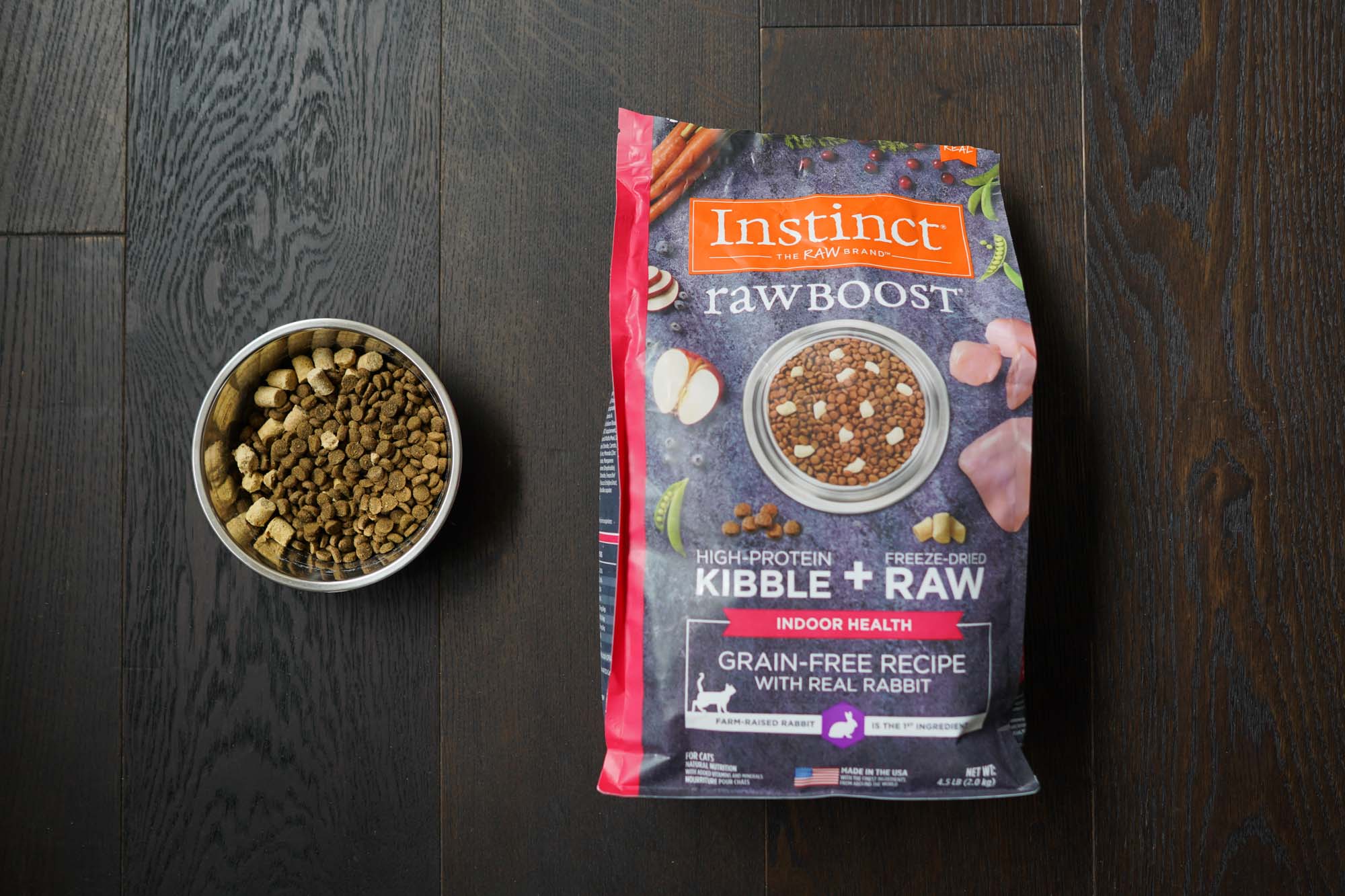 Instinct Raw Boost combines a grain-free kibble with freeze-dried raw chicken, duck or rabbit, depending on the recipe. The chicken recipe and duck recipe are recommended for outdoor/indoor cats, and because rabbit is lower in fat, the rabbit recipe is recommended for indoor cats, who are less active. There’s also a weight-control formula, but it’s only 1 percent lower in fat than the rabbit recipe (14 percent).