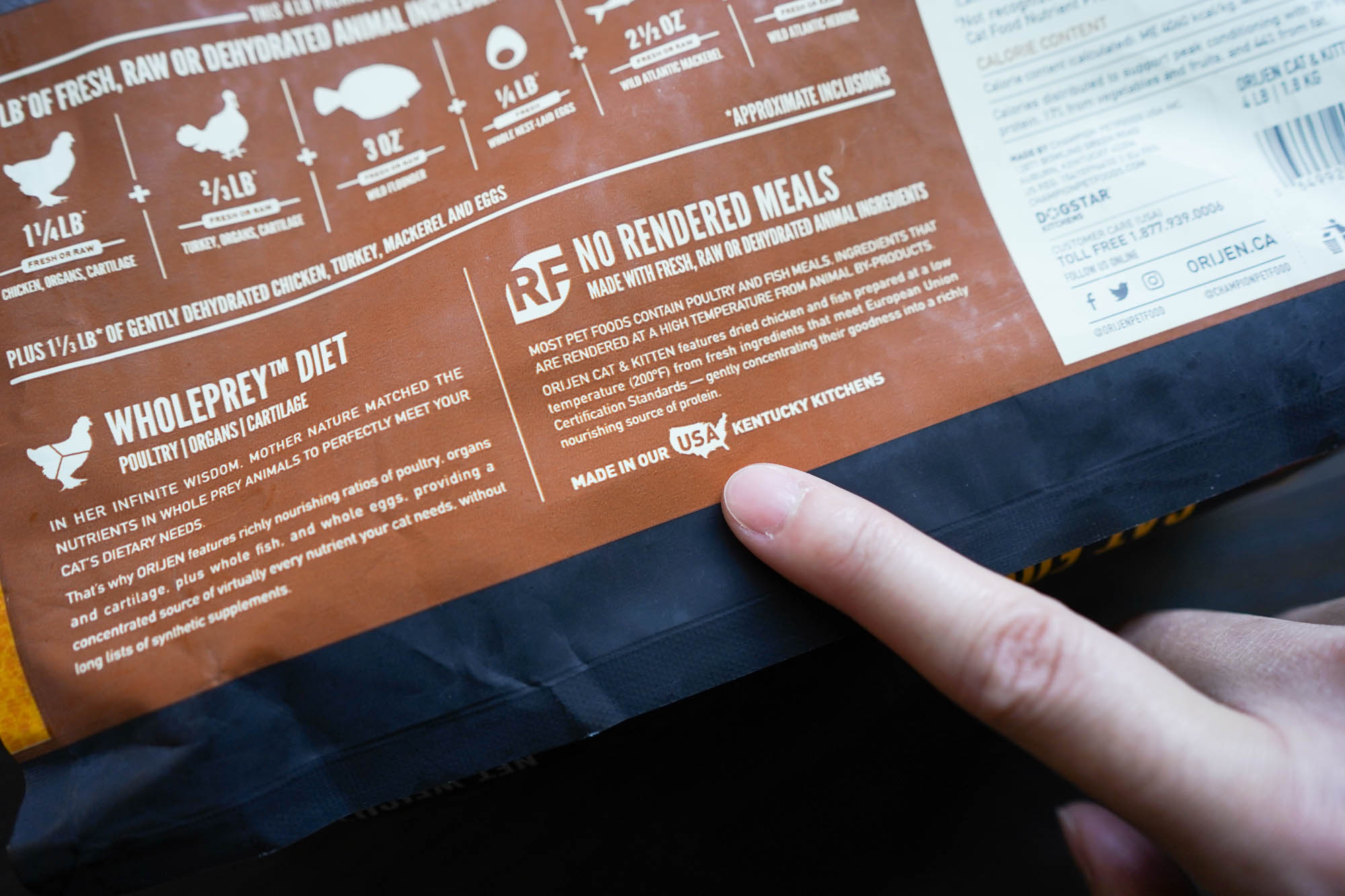 The ingredient list for the Cat & Kitten formula is impressive. The first ten ingredients are deboned chicken and deboned turkey, whole eggs, whole fish and whole chicken and turkey organs, such as heart and liver. Because so much moisture is lost during processing, and the whole meats and fish lose 75 percent of their weight, Orijen makes up for the loss by adding dehydrated meats and fish. Other pet food companies we analyzed add filler, such as rice or potatoes, to compensate for the loss in weight.