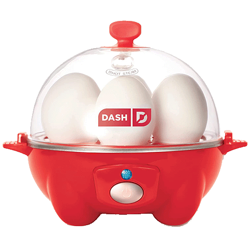 The Dash Rapid Egg Cooker has many of the same attributes as the Elite Gourmet. It’s a bit cuter in appearance with the lower half resembling the bottom of an egg and four chubby egg-shaped legs. Neither the egg rack nor the poaching tray has a built-in handle, but the rack comes with a detachable shaft that’s inserted through the center, which then serves as a handle for lifting the rack off the heating plate.