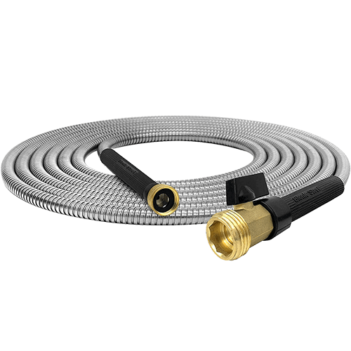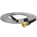 This stainless-steel hose is extremely lightweight compared to rubber hoses. It was a breeze to drag this around our patio and our garden. We only tested the 25′ version which is perfect for our patio or area under the pergola, but if we just wanted a single hose that reached our entire yard from a central faucet, a 50′ might do the trick, and a 100′ hose would definitely be an excellent choice.
