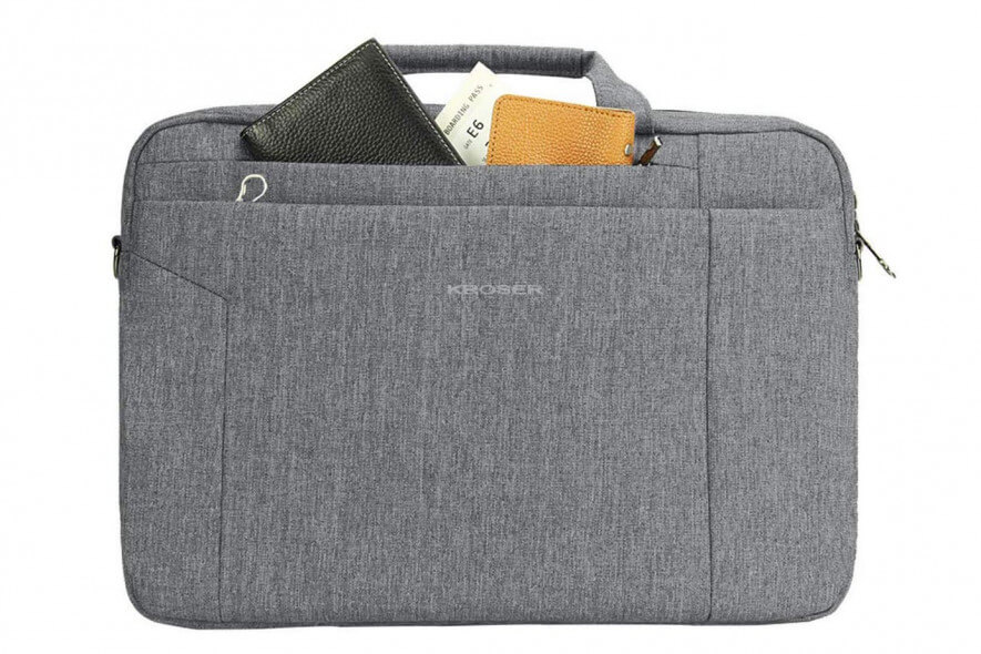 KROSER is known for manufacturing budget-priced laptop bags and backpacks. The KROSER – Laptop Bag has high consumer ratings on Amazon, but we found it to be inferior to all the other bags we tested. It’s more of a lightweight briefcase than it is a messenger bag, although it does have the requisite shoulder strap with a surprisingly well-cushioned shoulder pad. It’s made of a canvas-like polyester that KROSER claims is waterproof. We tested it, and water did indeed bead up and roll off.