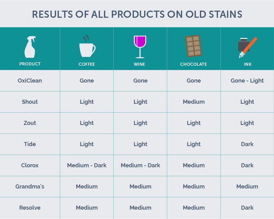 Through our study, we discovered that pre-treating or soaking the stained product allows the stain time to break down in the solution of your choice. Though we tested stain removers with different combinations of coffee, wine, ink, and chocolate fighters, the ones that worked the best were those that sat on the fabric and penetrated the chemical reaction the longest.