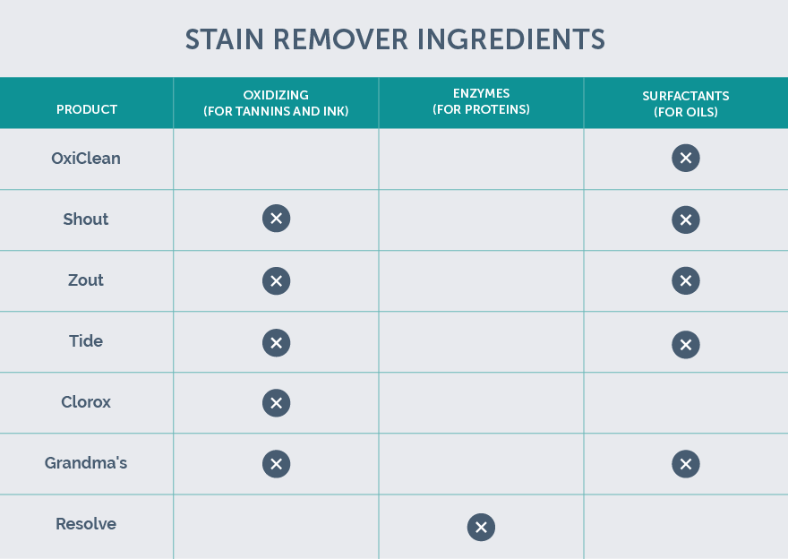 The trick here is to match your stain remover to the stain. Though stain-removing products don’t always print the ingredients on the bottle, they do seem to mention most of the active ingredients, and a quick online search can assist one in finding out if it is the solution you need.
