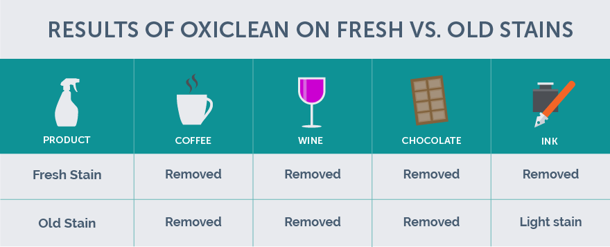 What this means is that even though OxiClean is an oxygen-based stain remover and should work best on stains caused by coffee and wine (tannins), it successfully broke down dyes and the complex chocolate spread stain with protein and oil, as well.