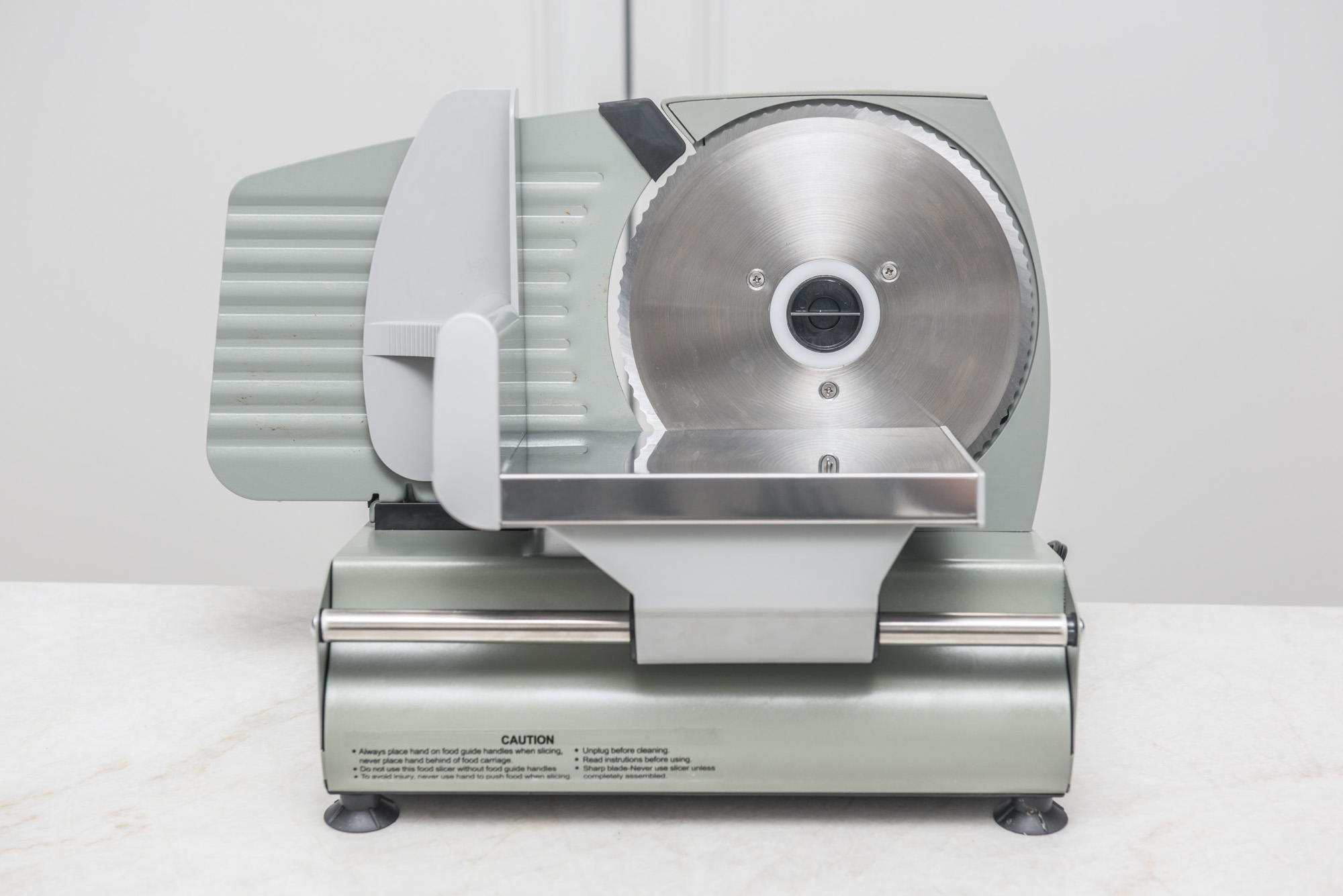 The Arksen – A-048-GM-48087 meat slicer performed almost as well as the Cuisinart. It’s also the only other slicer we tested that had a true-zero adjustment setting, so the blade is recessed in its casing. Similar to the Cuisinart, the Arksen has a curved adjustment knob that turns away from the blade. Initially we found the knob stiff to turn, but after repeated use, it was easier to adjust.