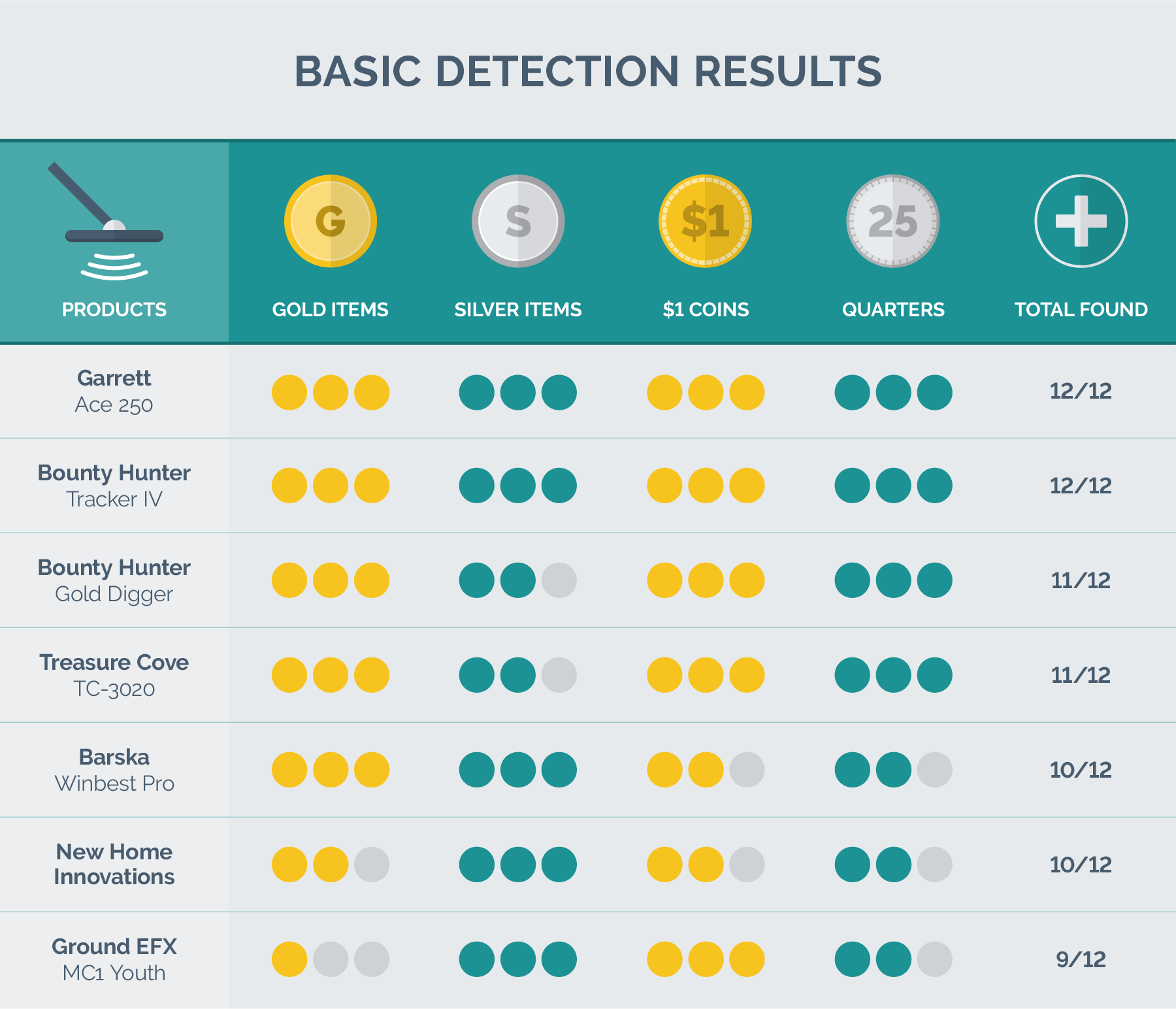 Once again, in line with our above tests, the Garrett – Ace 250 had the best score in the underwater test, locating with perfect accuracy all six of the underwater items. Surprisingly, here the Ground EFX – MC1 Youth did not score the lowest. Instead, the Treasure Cove – TC-3020, New Home Innovations – Starter Kit, and BARSKA – Winbest Pro Edition all tied for the worst score, locating four out of the six underwater items.