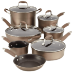 | Analon | $$$$ | Stainless steel, hard anodized | Rubber-wrapped stainless steel | 400 °F | No | 7: 1 stockpot, 3 saucepans, 2 saute, 1 skillet | 5 |