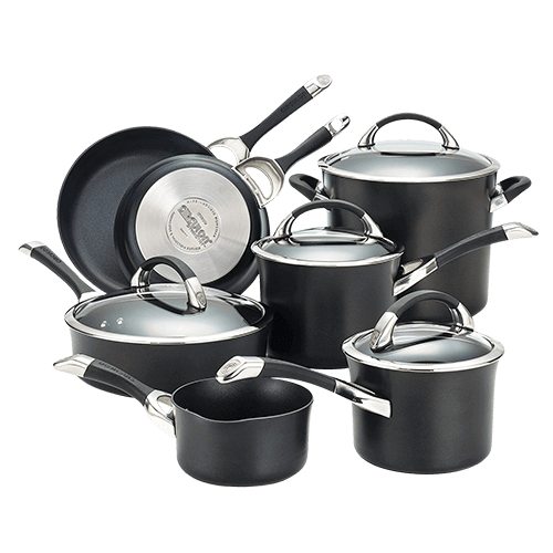 | Circulon Symmetry | $$$ | Stainless steel base, hard anodized (PFOA, lead, cadmium free) | Rubber-wrapped metal | 400 °F | Yes | 7: 1 stockpot, 3 saucepans, 1 saute, 2 skillets | 4 |