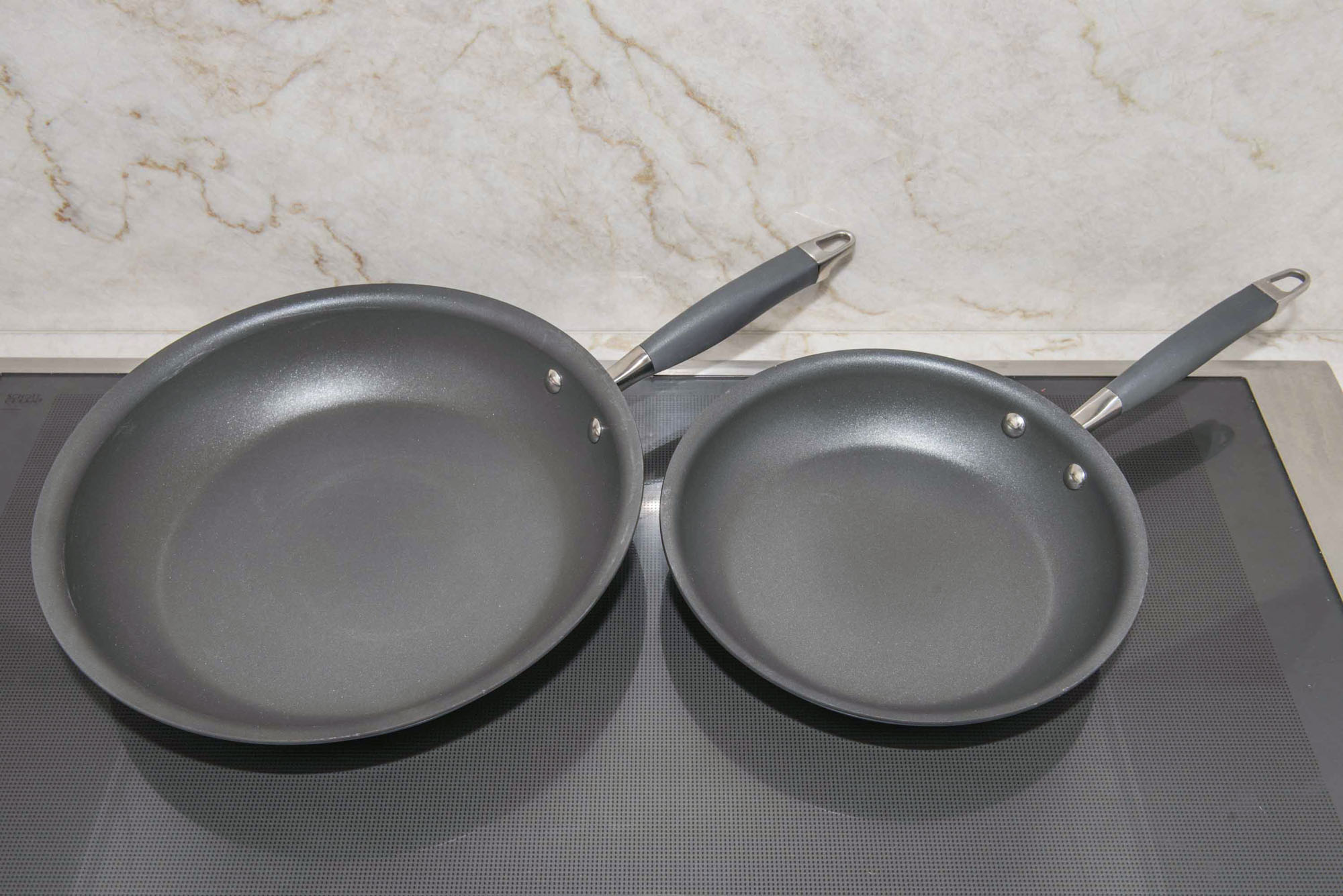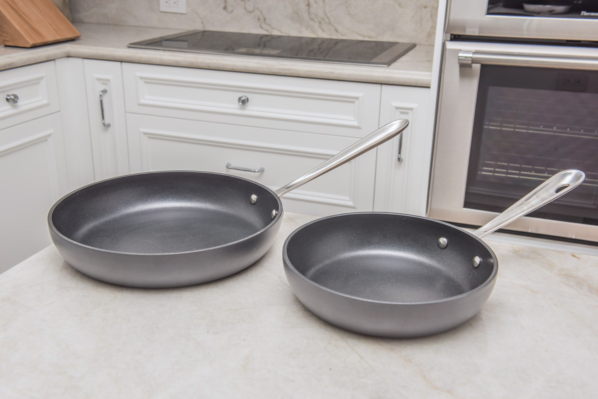 The All Clad – E785S264 nonstick pan set includes an 8-inch skillet and a 10-inch skillet. Both are similar in construction to the Anolon, but the All Clad pans are designed like classic saute pans: Low, straight sides and long handles. These features allow for searing meat and making pan sauces, but those tasks are more appropriate for a cast-iron skillet or stainless-steel pan.
