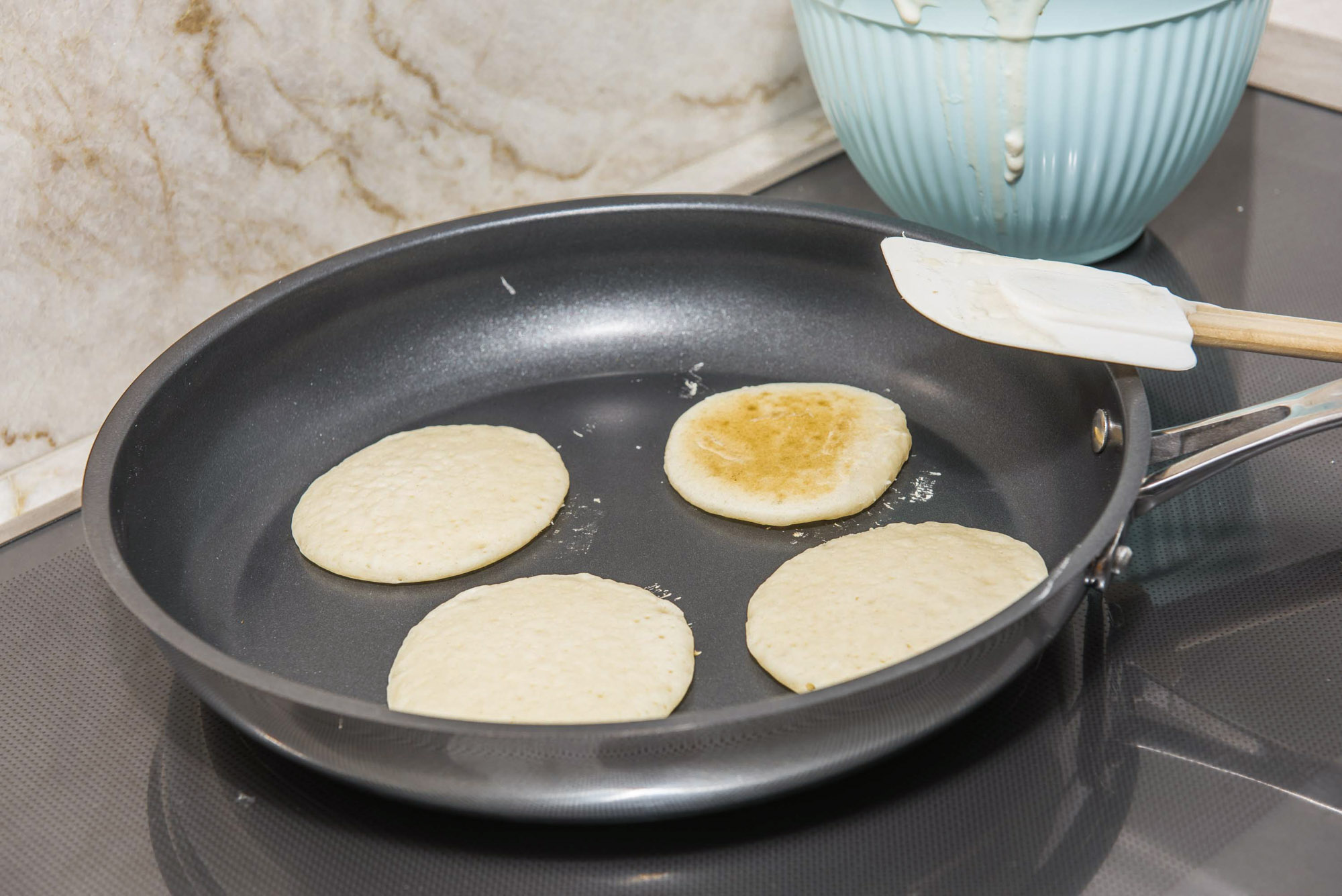We used this basic recipe for pancakes and poured circles of batter into the pan: one in the center, one close to the handle and two on the opposite side of the handle. We noted whether the center pancake cooked faster than the pancakes near the handle and sides of the pan. We also attempted to flip the pancakes without using a spatula. Only if the pancake stuck did we use a silicone spatula to release them from the pan.
