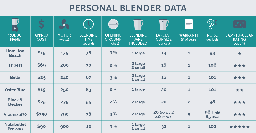 When you put everything together, your blender choice comes to a few decision points: budget, use case, and need to have control (or power) when blending. To make comparison easier, we’ve drafted this chart highlighting the main points of our tests in addition to the blender features of the top seven models, so you can make that decision for yourself.