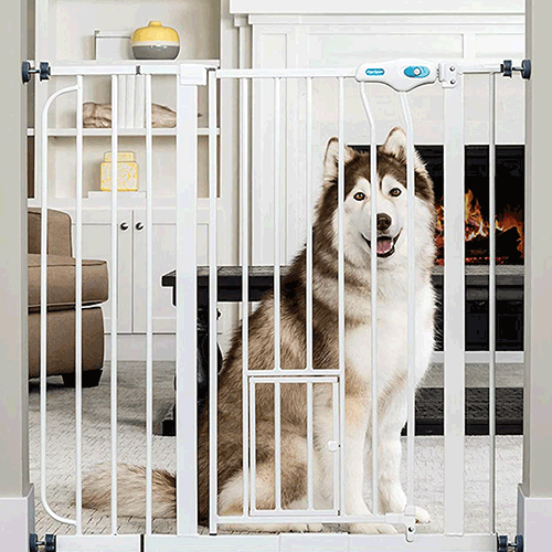 For its reliable locking module, small pet door and extra tall framework, we easily recommend the Carlson Extra Tall gate for cat owners, but it can surely work for dogs as well. If you have both, then perfect! This gate towers over the rest — measuring 41 inches tall and includes a small pet door at the bottom. Many consumers report that the extended height deters many cats from jumping over the gate. If you need to provide access for your small pet to travel through freely, the small pet door offers that option.