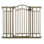 If you’re looking for a more semi-permanent gate with a swinging door, the Summer Infant model impressed us all with its build quality, easy one-handed use and auto-locking feature. Its heavy construction and bronze metal finish made for an impressive design. The bars within the frame are arranged tightly and are not vulnerable to bending when force is applied.