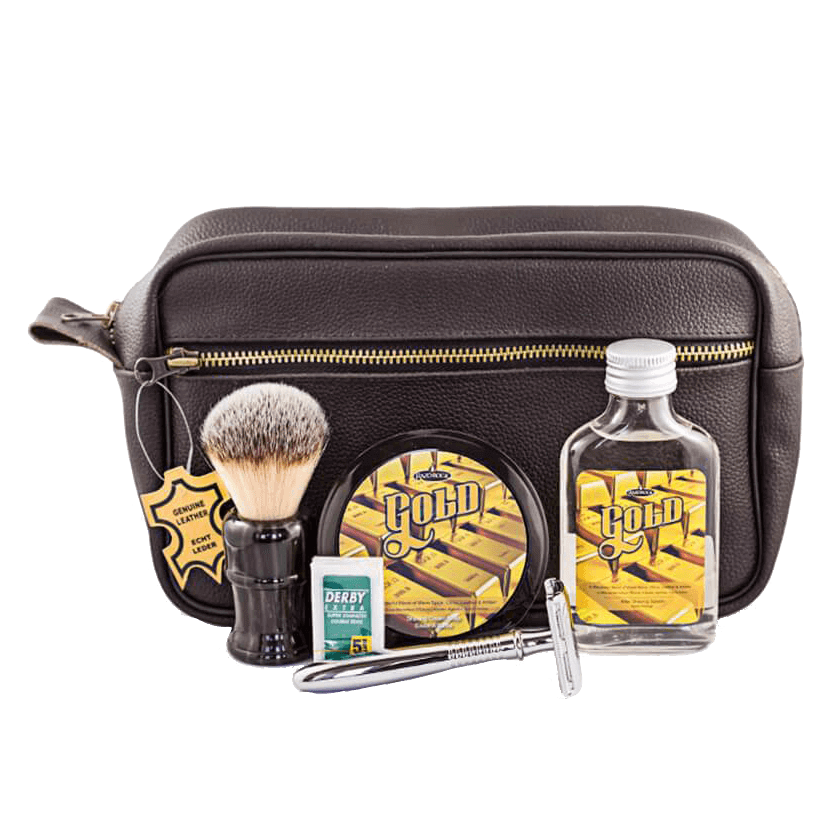 The Razorock 5-Piece Set from Italian Barber is easily the best value in a complete kit of shaving products. The razor and brush are reliable standards that make a perfect introduction to wet shaving, and the soap, aftershave and travel bag make this a complete set. It’s not TSA-ready for travel in a carry-on, but it’s a perfect kit to throw in checked luggage.