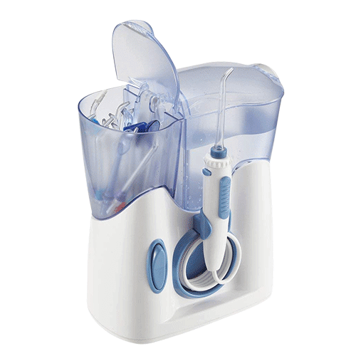 Some very innovative thinking took place in the design of this flosser: the lid doubles as a dust-proofer and storage for up to four tips, so it keeps the both the countertop clutter-free and the water inside clean. The Belmint is akin to the Waterpik – WP-660 (the runner-up) in many respects: it has an on/off switch on the handle and a knob you turn to choose the strength of the stream. It also has a couple minutes’ water tank capacity, and there is a timer with thirty-second warnings.