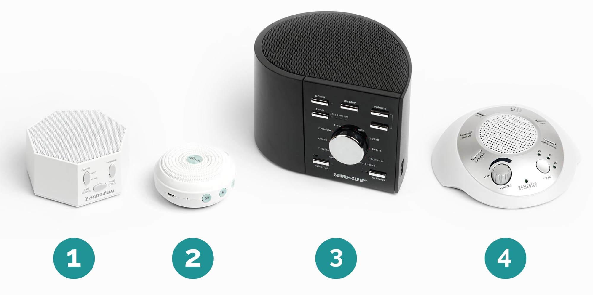 Our group of seven white noise machine finalists included three analog machines and four digital machines. We tested only the “white noise” and “fan” functions of each machine, ignoring any other sound options like waterfalls and ocean waves.