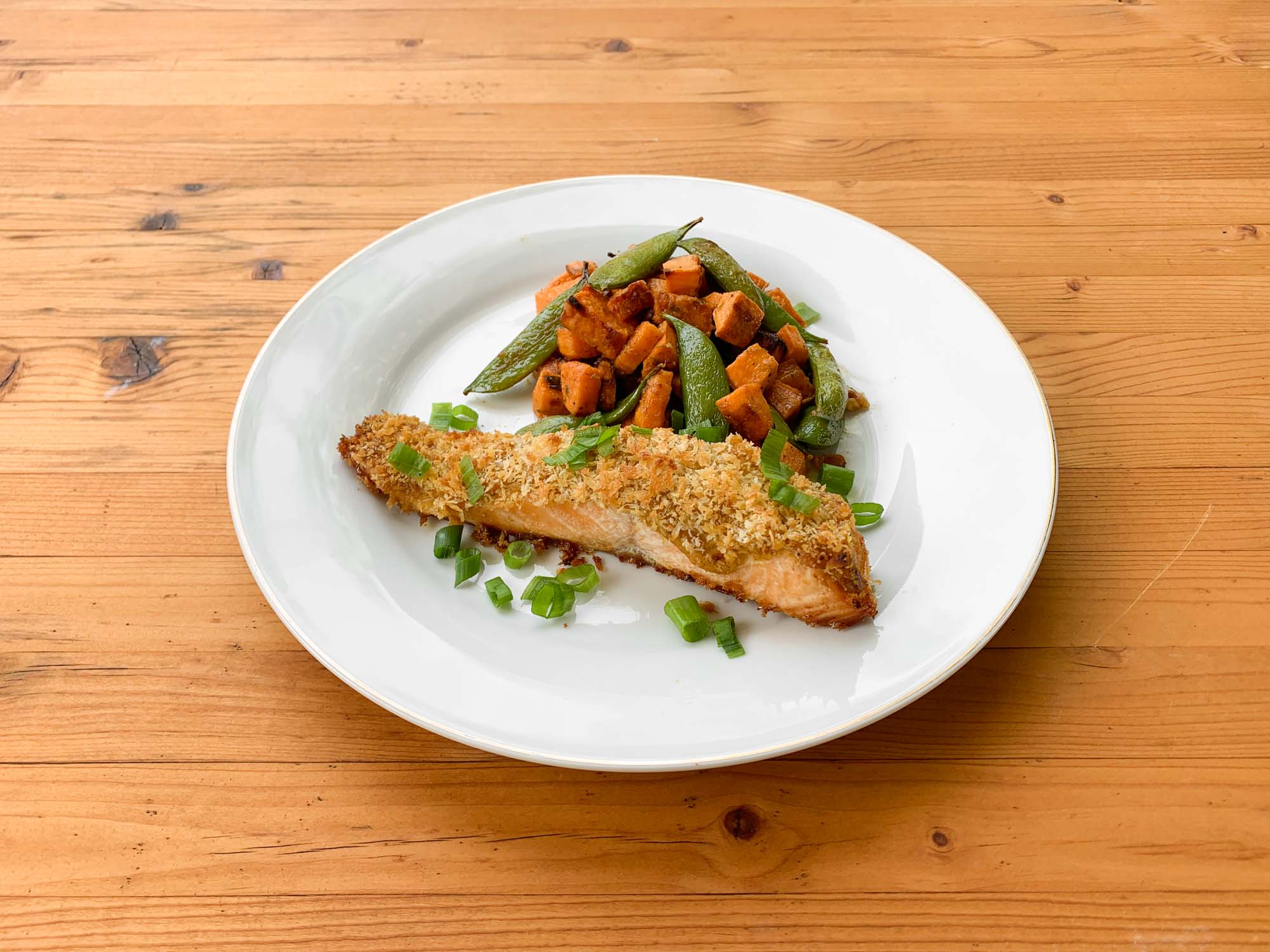 The side dish for this recipe was diced sweet potatoes roasted with sugar snap peas and then finished with a ponzu dressing. The recipe left out peeling the sweet potatoes before dicing them, even though the recipe photo clearly shows it. We also felt that 1 tablespoon of sugar was too much to add to the ponzu dressing, so we simply sprinkled in about ½ teaspoon, which gave the dressing a slightly sweet tang.