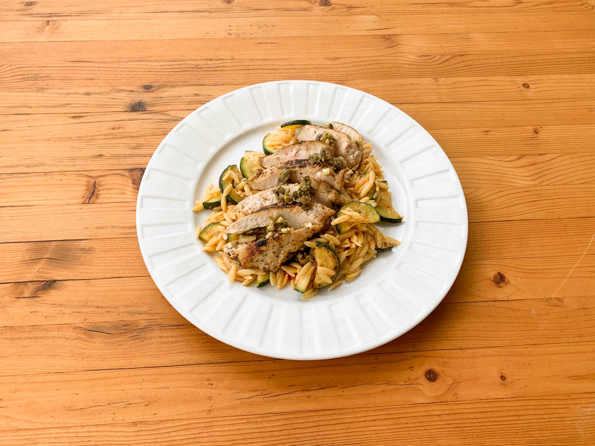 The side dish is Creamy Calabrian Zucchini and Orzo, and it was tasty, but it lacked zing. The preparation of the zucchini — a simple saute with garlic and chili paste — is excellent, and we’ll be trying it with other vegetables. The orzo, though, was bland, even with the addition of creme fraiche, and in mixing the zucchini and orzo together, as the recipe instructs, the orzo actually took away from the zucchini’s flavor.