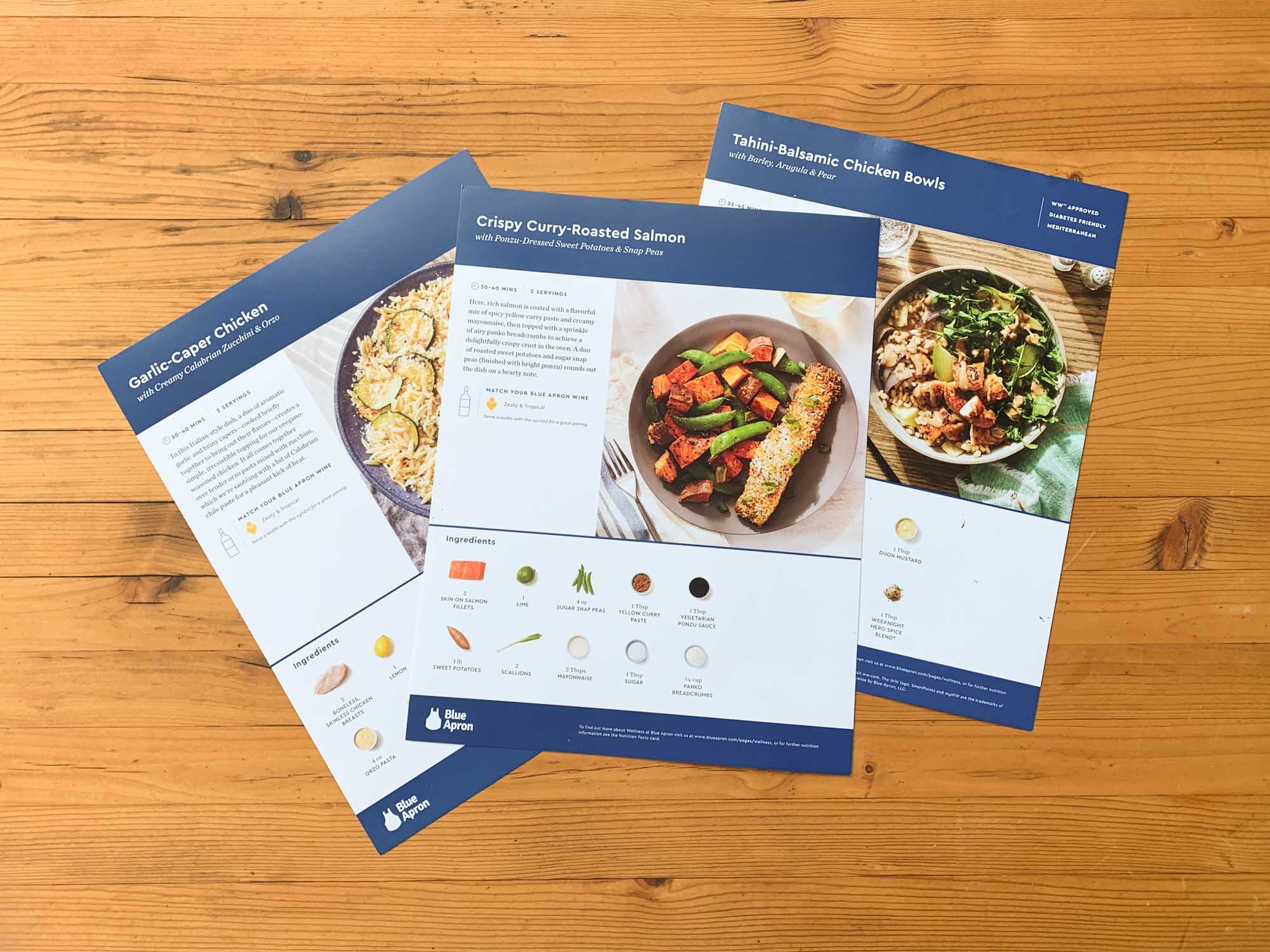 As with most meal-kit delivery subscriptions, an 8.5”x11” recipe card is included for each recipe. Blue Apron’s cards are sturdy and attractive with photos of the ingredients and the completed dish on the front and four-to-six photos of important steps in the recipe’s preparation. We actually found the photos to be helpful and illustrative for prepping the ingredients and for how they should appear when cooked.