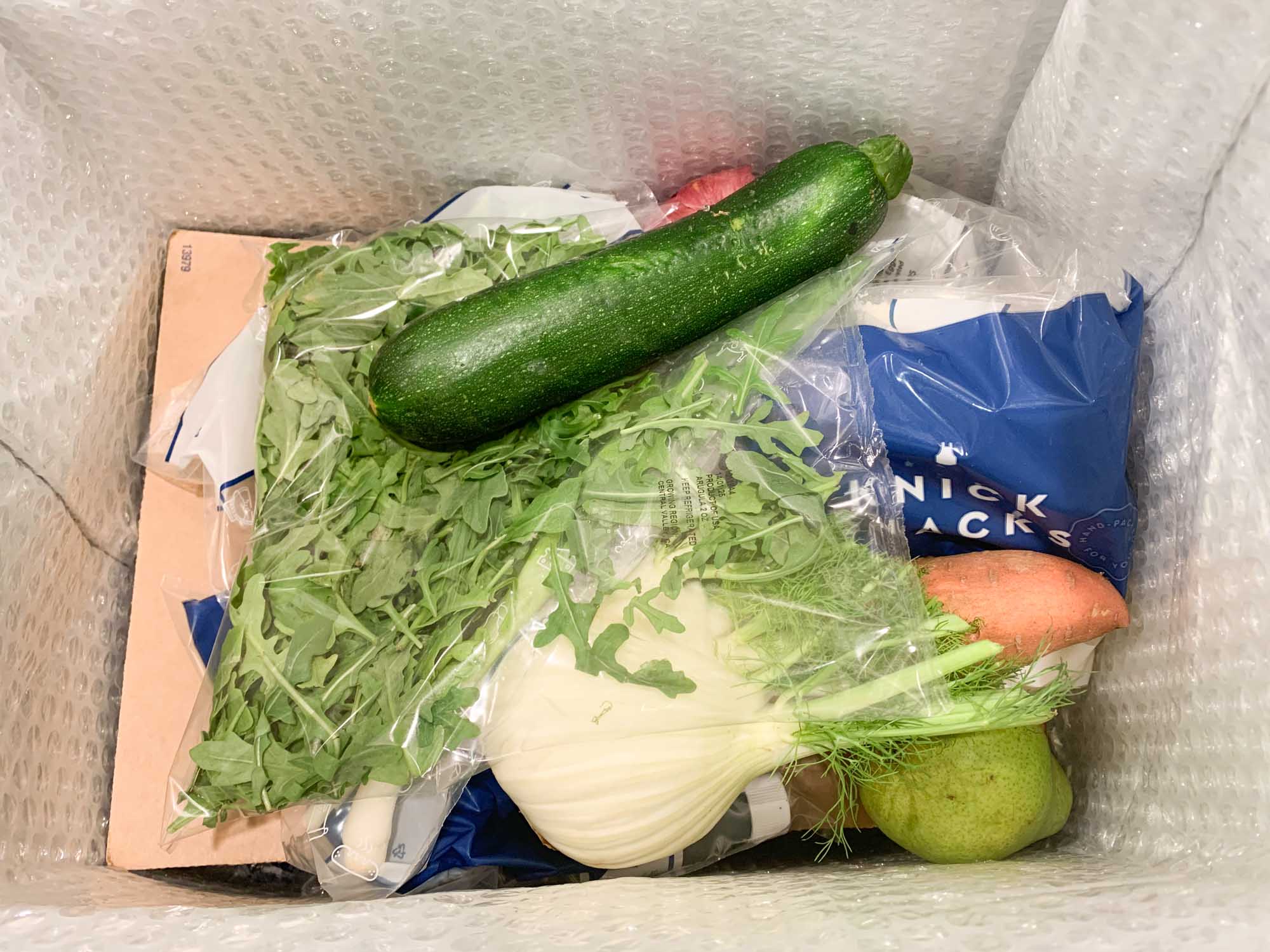 In keeping with the poor email communications, we heard nothing from Blue Apron until the day before delivery, when we were informed that our box was packed and shipped from its San Francisco-area fulfillment center. It was delivered the next evening at 6:45 pm (the other subscriptions were delivered in the morning), and we were concerned about perishable items. Blue Apron had the smallest box — a good thing, since there is so much packaging wastefulness with all other subscription services — and it was well-insulated with foil-lined bubble wrap.