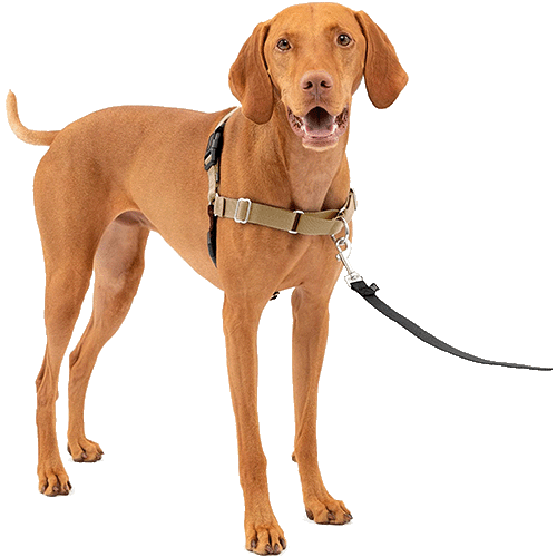 For a puller, consider choosing a harness with a chest clip. When a leash clips at the front of the chest, it works as a barrier that the dog can’t get past and slows them down.