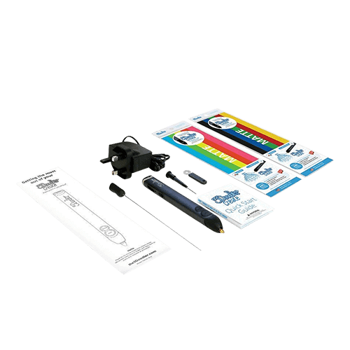 This model of 3D pen was also one of those designs that had multiple brandings under different names and colors. This particular brand did an impressive job of going “upscale” in its packaging, but it fell short in execution. The all-white box harkens back to Apple’s branding style, which all too often companies borrow in attempt to bump up in price bracket. This model comes with a matching pen stand in matching rubberized black.