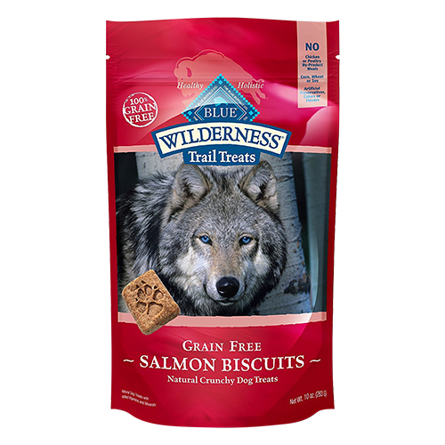 The Blue Buffalo – BLUE Wilderness Trail Treats salmon biscuits are grain-free, packed with aromatic salmon and little else.