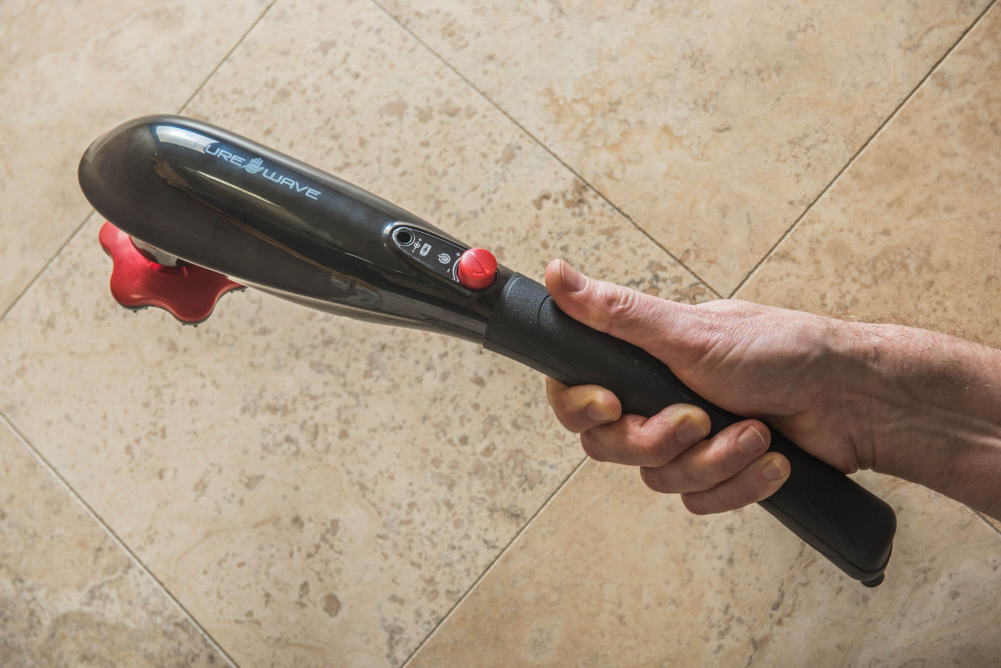 The PureWave is cordless: It charges in one hour and stays charged for two hours or longer. It’s a sleek 16-inches long with a rubberized handle that’s half the length, so you can grip it midway or by the end, depending on which body party you’re massaging. The PureWave weighs only 1-½ pounds with most of the weight in the motor, which allows you to dangle the head down the length of your entire spine.