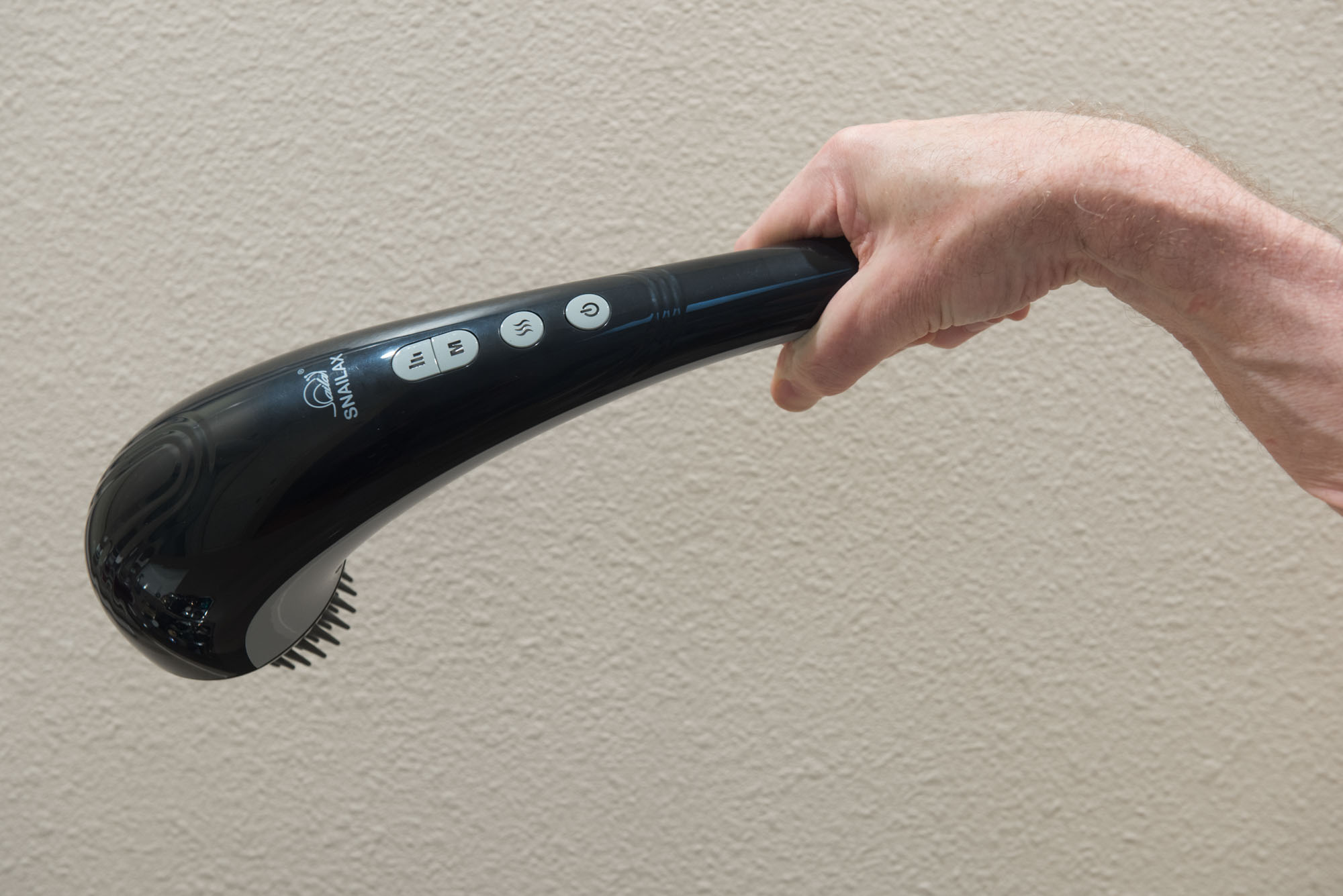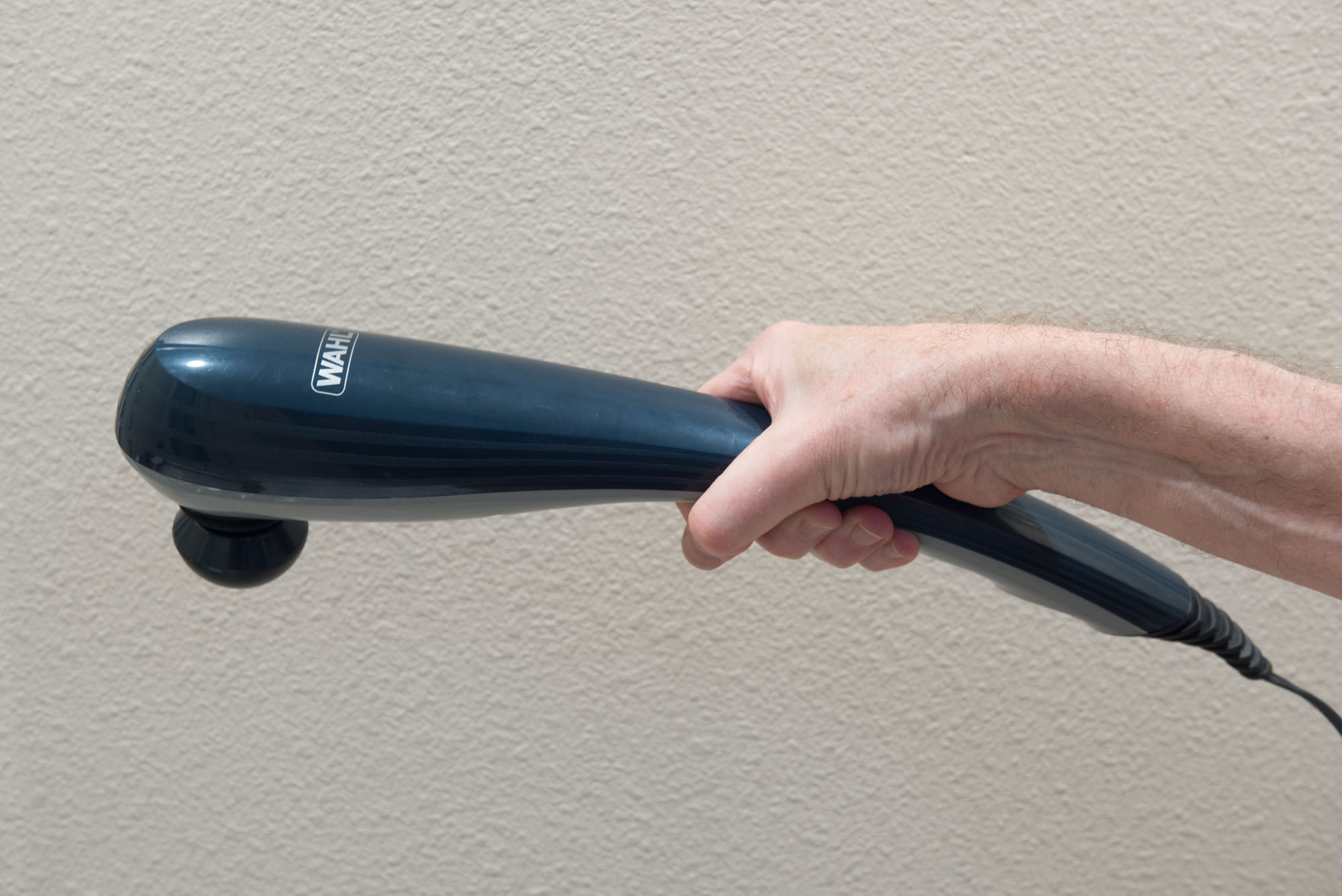 The Wahl is 15-inches long and isn’t too heavy. Two of the attachments have hard pointed ends, and we found these to be too uncomfortable, even on muscle areas. The round-ball attachment worked with neck and shoulder muscles. Best of all was the large, flat disc, which could be used all over the body without discomfort. Intensity is adjusted with a dial on the underside of the handle. Its position, though, makes it too easy to accidentally change the level.