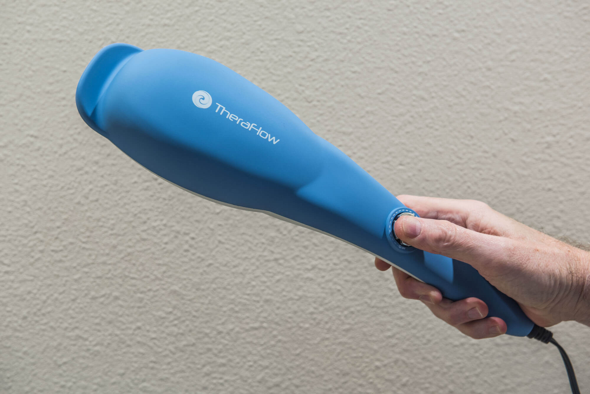 The TheraFlow was one of our favorite massagers, but it has a design flaw we couldn’t overlook. The motor head is quite heavy, and the handle is too short, so you need to grip the massager higher up. Since the power/level dial is on the upper part of the handle, we kept slipping and either changing the level intensity or shutting the unit off.