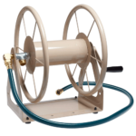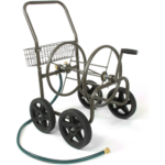 - It has a sturdy, heavy-duty reel that can hold a rubber or vinyl 100′ garden hose.