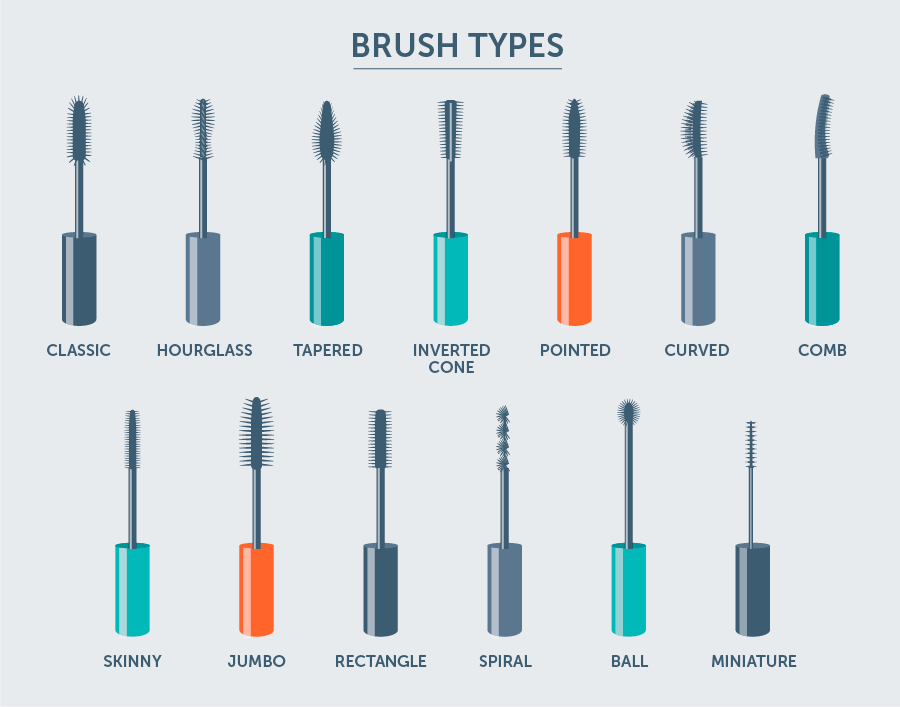 Curved: The main purpose of a curved brush is to curl your lashes. It mimics the natural curl of the lashes, hugging your lashes from the waterline to the tip. To add even more curl and prevent drooping, start with an eyelash curler and coat with a waterproof formula.