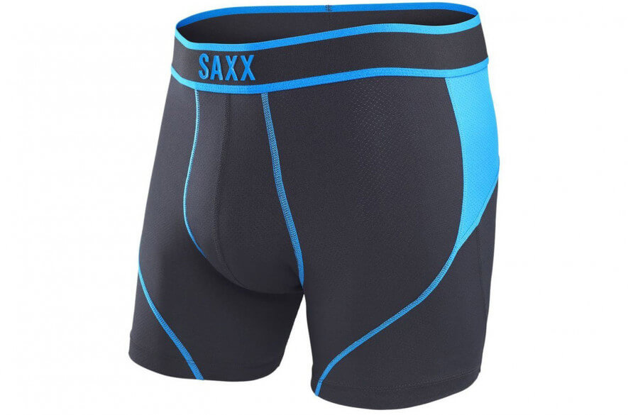 Made of 85% nylon and 15% spandex, the SAXX – Kinetic Boxer is for guys with an active lifestyle. In fact, even wearing them gives the illusion that you’re a speedster. All Kinetic boxers are predominantly black with a colored racing stripe (we tested electric blue) that runs across the back upper waist and down each thigh. The same color piping outlines the crotch, accentuating what you’ve got underneath. The mesh nylon fabric is breathable, but it also molds itself onto your legs and butt.