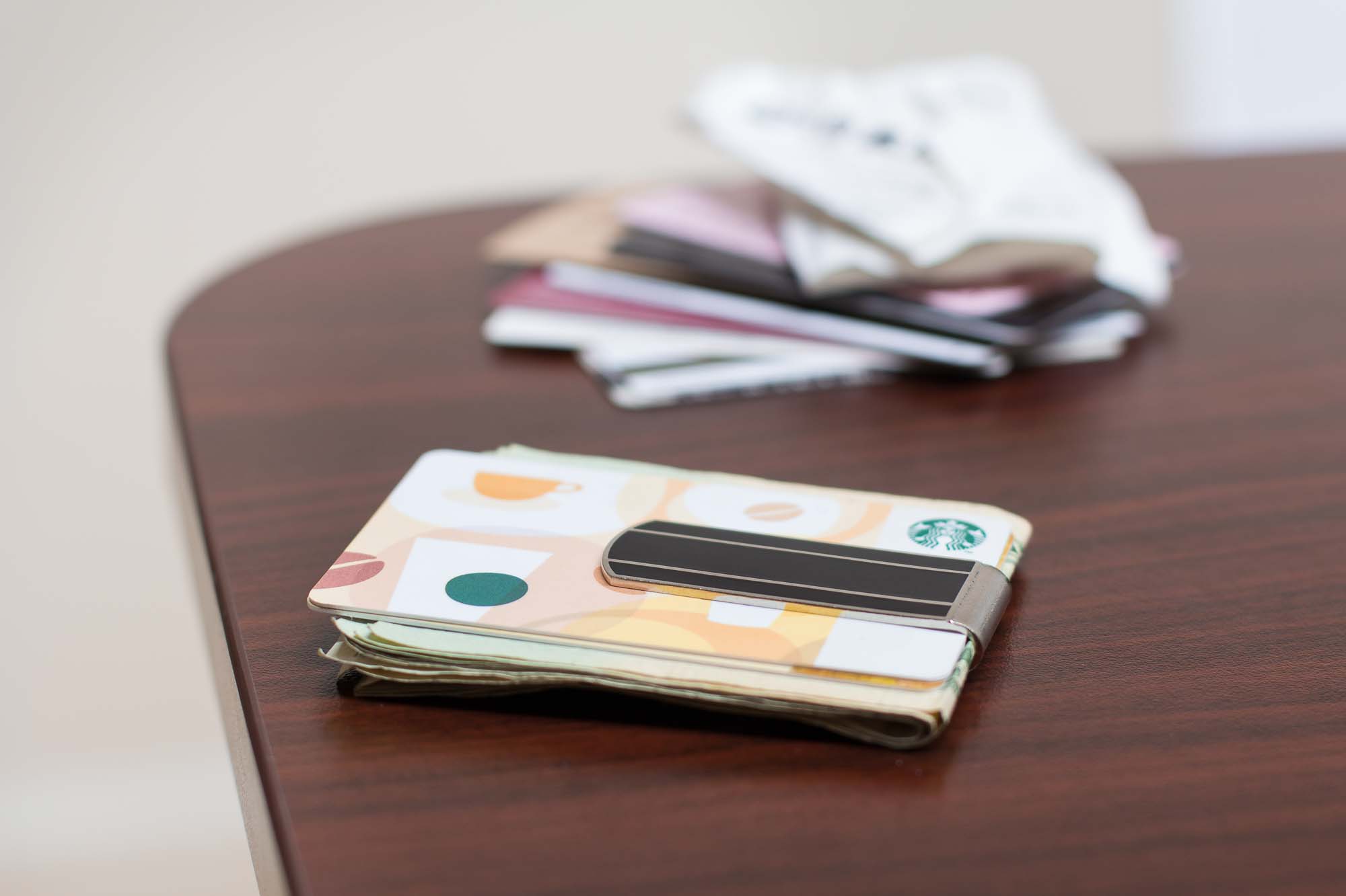 Type of clip: There are a few different types of clips from which you can choose. If you’re planning to carry primarily cash, choose a money clip or band. If you have several cards to carry as well, you may want to consider a money clip wallet.