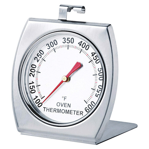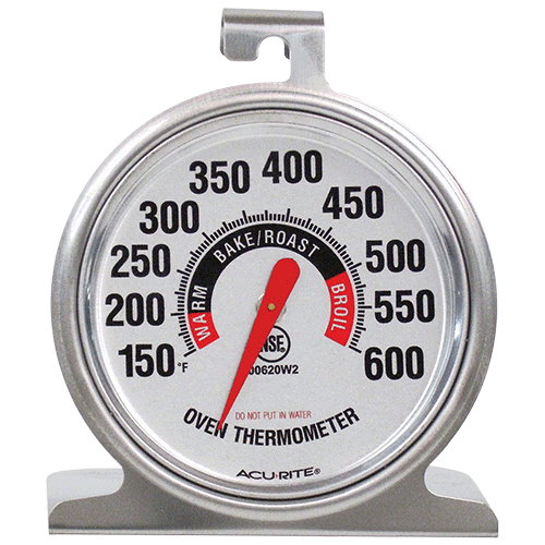 The Winco is another large-face oven thermometer. Similar in design to the Taylor, it has a 3-inch face, but it’s more difficult to read. Temperature numerals and degree markings are large and black up to 300° F; from 305°-500°, the numerals are in a pale red that disappear behind oven-door glass. Degrees in Celsius are also shown in black up to 140° and in red after 150°.