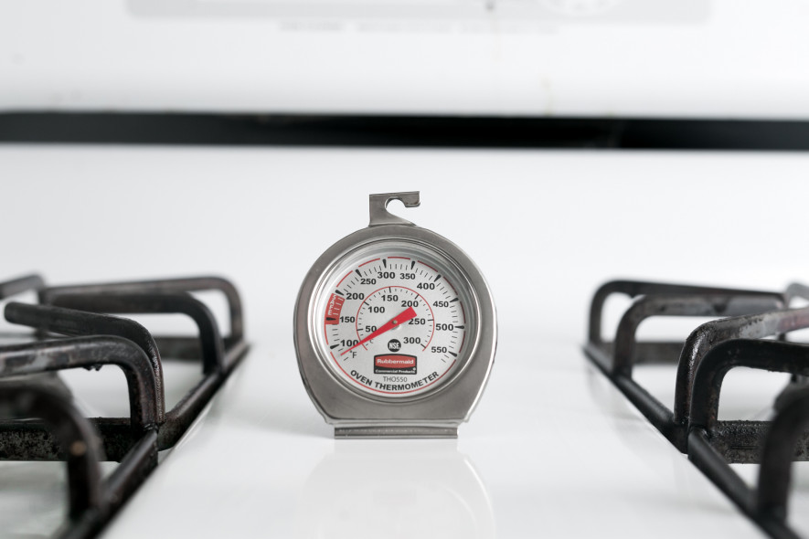 We lined up the thermometers in the center of the cool oven. The Rubbermaid – FGTHO550’s base is only 1.5 inches, so it had to be hung. We heated the oven to 250°, 350° and 450° and recorded each thermometer’s readings. Over the course of three days, we performed these tests seven times, letting the oven cool before starting again.