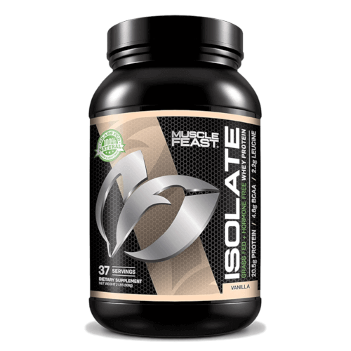 The Muscle Feast powder has an impressively streamlined ingredients list (only four ingredients) and is made with whey protein isolate from grass-fed-cow milk with no extra hormones. Because whey protein isolate is more filtered than regular whey protein, it contains more protein and less lactose and fat than regular whey protein.