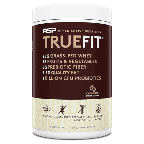 The gluten-free RSP powder is a well-rounded meal replacement shake. Each serving contains 25 grams of milk protein from grass-fed cows raised without artificial hormones, including 5 grams of BCAAs. The 8 grams of fiber comes from 12 non-GMO fruits and vegetables, and the 3.5 grams of quality fats includes 1 gram of MCT oil. The powder also includes probiotics and enzymes to aid digestion.