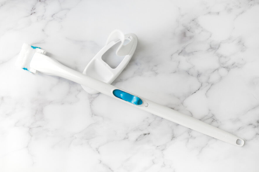 Fresh Brush’s holder is slim and unobtrusive, but it doesn’t have a place to store extra cleaning pads. It’s also quite lightweight, making it easy to knock over. Unlike the Clorox design, you’ll need to touch the cleaning pads in order to attach them.