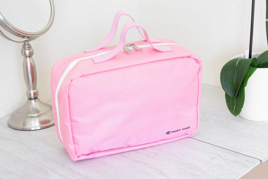 The Expert Travel looks like a lunchbox, but we love that it unfurls vertically and completely (similarly-shaped bags on our list only unfold halfway). We were surprised at how well makeup wiped off of it despite its white lining, and it also lived up to its waterproof claims when we doused it in water.