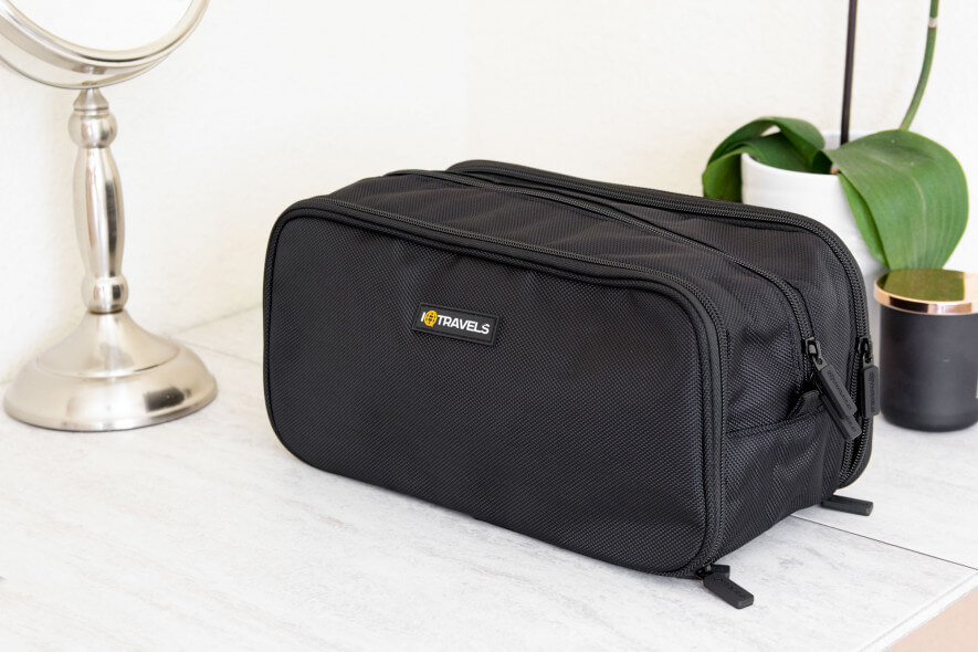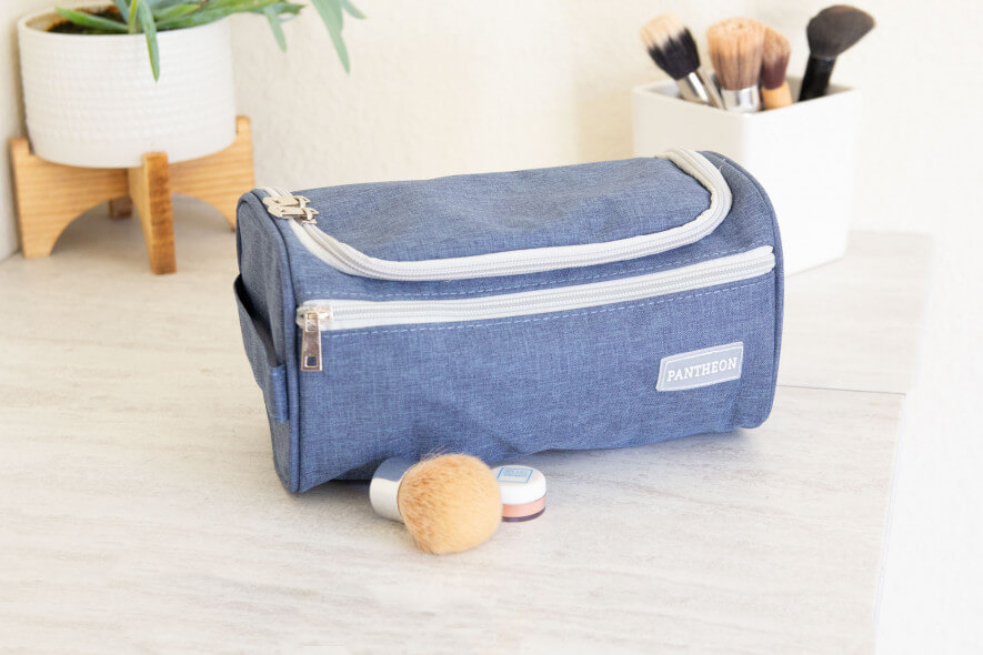 When traveling, we love how its flat design means fewer items cover each other. The bag can sit on the counter without worrying about toppling it over while digging for items.